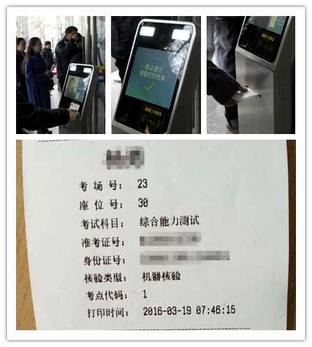 考生站在核验设备面前,在二代证读卡器区域刷身份证,设备在读取考生身份证信息的同时,摄像头会现场抓取考生的面部特征,再与身份证件照片的面部特征进行逐一分析比对,两者相符则显示“验证通过”。考试中心提前将全部信息录入设备,考生入场时,可随意使用任何一台识别仪进行身份核对,并打印入场凭条。凭条显示有考生姓名、考场号、座位号、准考证号、身份证号等全部信息的入场凭条,考生凭入场凭条进入考场。从考生站到核验设备前到考生拿到入场凭条,整个过程用时仅8秒钟。